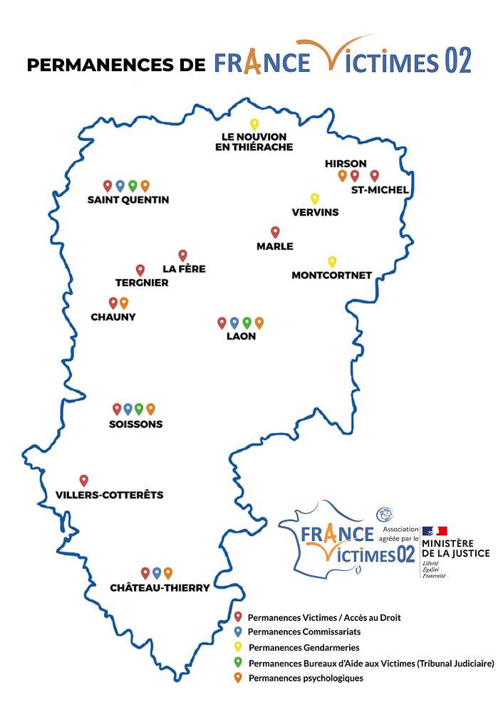 Des permanences hebdomadaires sont tenues dans les trois bureaux d’aide aux victimes (BAV) du département. Elles ont lieu le lundi au tribunal judiciaire de SOISSONS, le mardi au tribunal judiciaire de SAINT-QUENTIN et le jeudi au tribunal judiciaire de LAON.